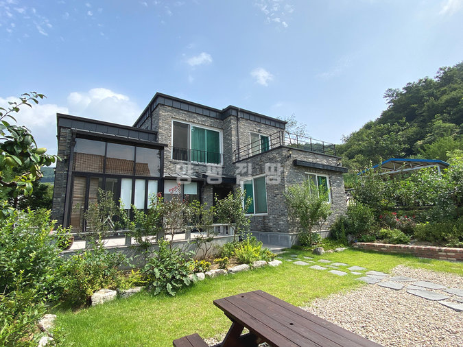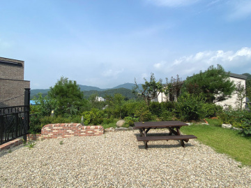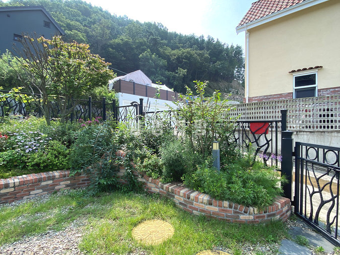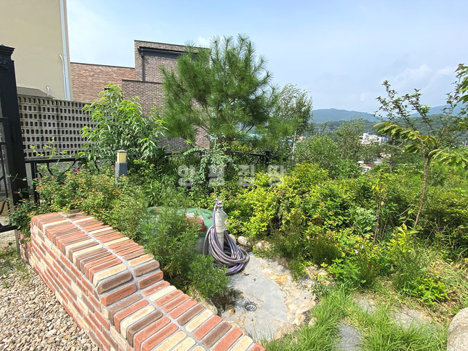 정원은 잔디와 디딤석, 조경수, 꽃나무로 꾸며졌으며, 주차공간과 야외 테이블이 마련되어 있습니다.