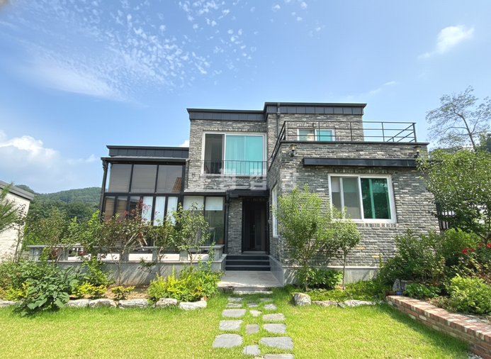 철근콘크리트 구조로 최고급 자재와 고단열 공법, 친환경 자재를 사용하여 지어진 모던 스타일의 주택으로, 1층에는 거실, 주방, 침실, 욕실이, 2층에는 침실 2개, 욕실, 테라스, 다용도실, 창고가 있습니다.