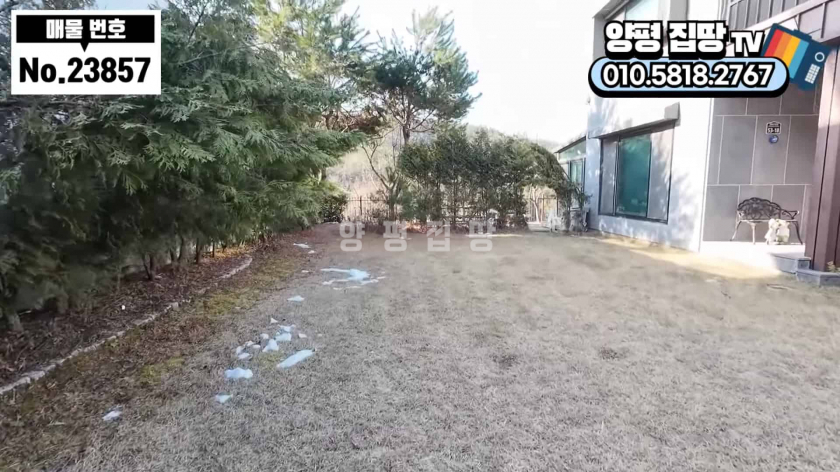외부는 잔디마당과 작은 텃밭, 조경수로 꾸며져 있으며, 주차장은 시멘트 바닥과 철문으로 정리되어 있습니다.