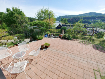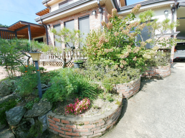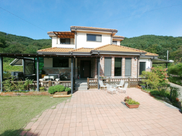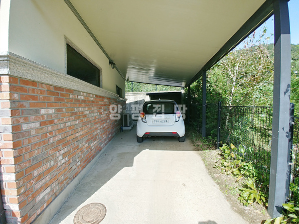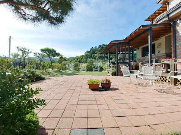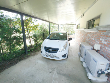 외부는 잔디와 블록 포장으로 정리된 마당에 목재 데크와 비가림 시설이 설치되어 있고, 주차는 3대까지 가능합니다.