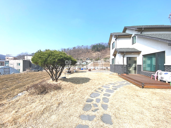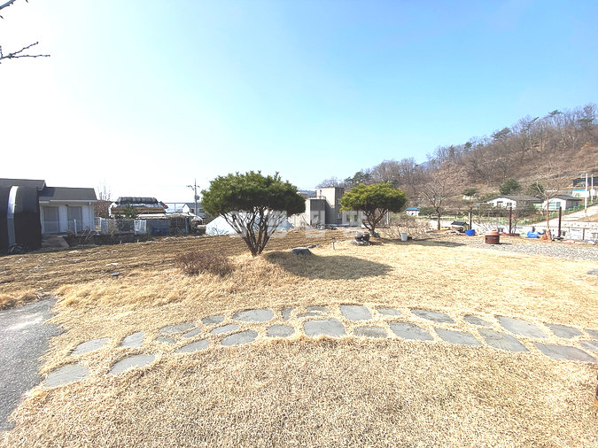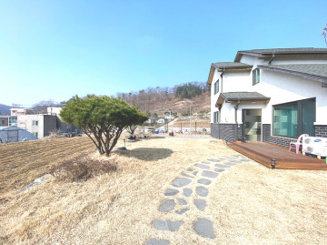 마당은 잔디와 기본 조경이 어우러져 있으며, 디딤석과 야외 공간이 마련되어 여유로운 생활을 즐길 수 있습니다.
