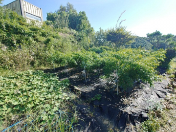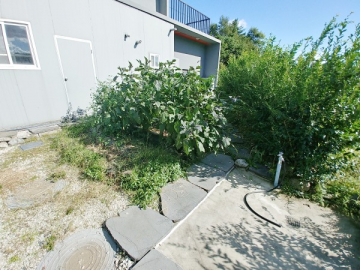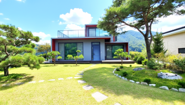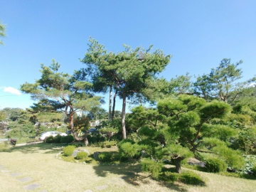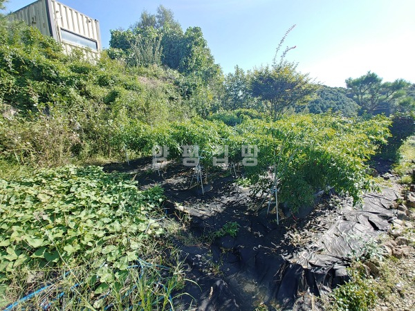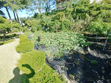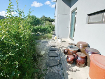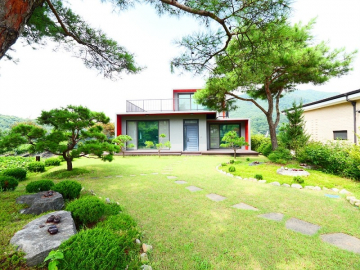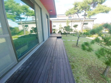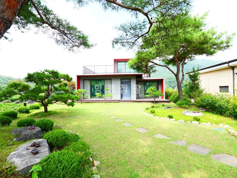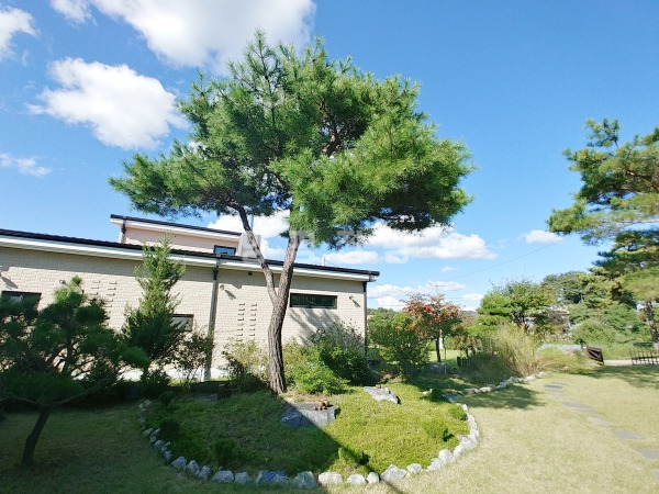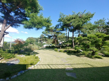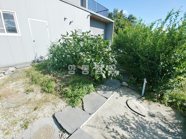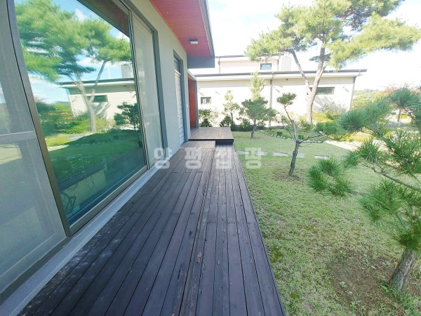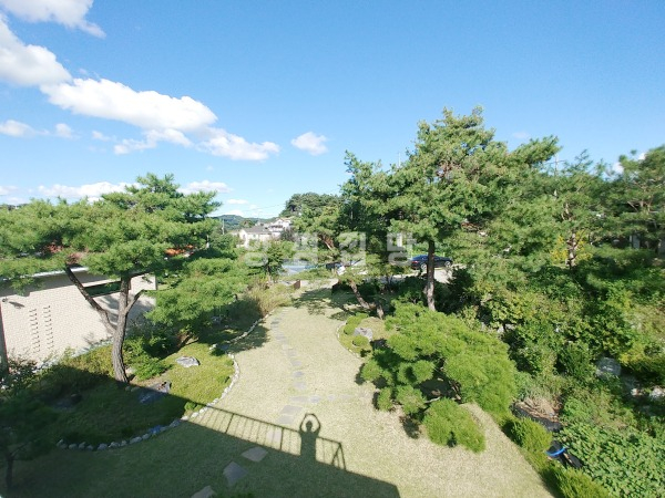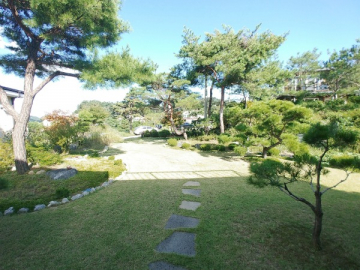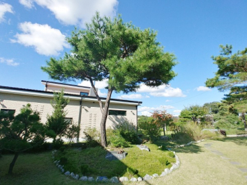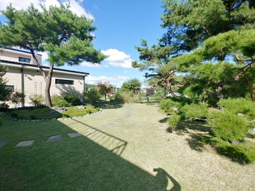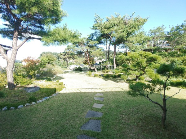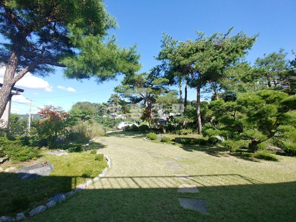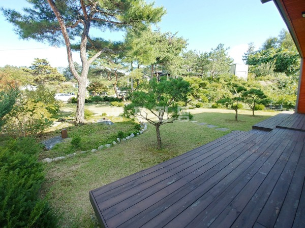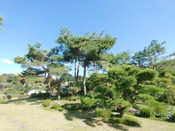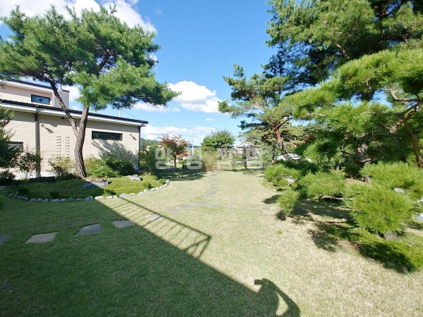 넓은 정원은 고급 소나무와 다양한 조경수, 화단과 텃밭이 어우러져 있으며, 데크와 주차 공간이 함께 구성되어 깔끔하게 관리되고 있습니다.