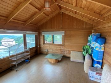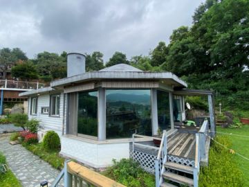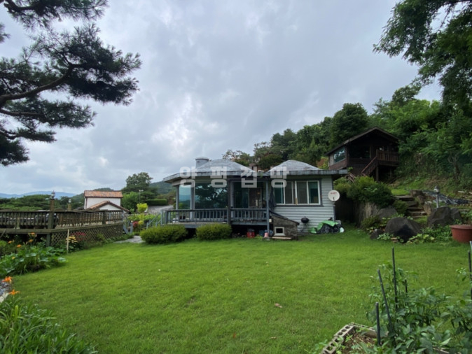 목조 구조로 지어진 주택은 따뜻하고 포근한 느낌을 주며, 거실과 주방, 방 두 개와 욕실 두 개로 실거주하기에 적합한 구조를 갖추고 있습니다. 내부 거실은 통창으로 채광과 조망을 동시에 확보하며, 벽난로가 있어 계절에 따라 아늑한 분위기를 연출할 수 있습니다.