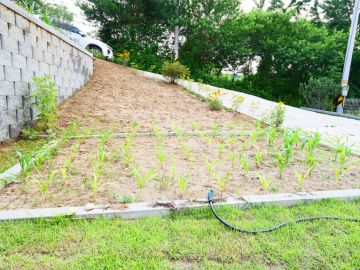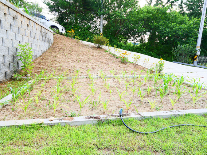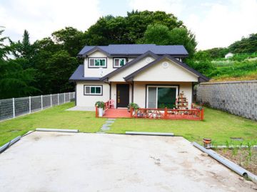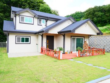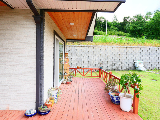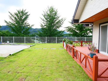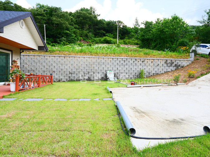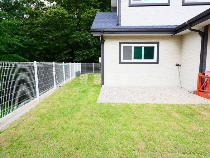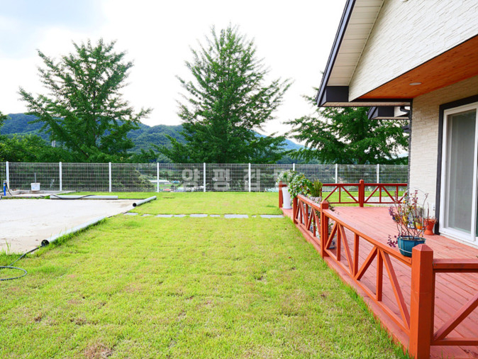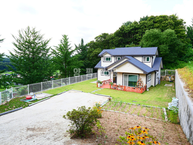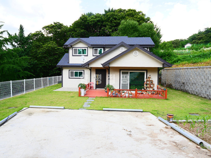 내부는 1층에 거실·주방·침실·욕실, 2층에 침실 2개와 욕실이 있는 구조로 생활 동선이 효율적입니다. 잔디정원과 넓은 데크, 텃밭과 주차공간이 조화롭게 어우러져 가족이 함께하기 좋은 외부 공간을 갖추고 있습니다.