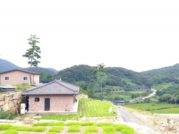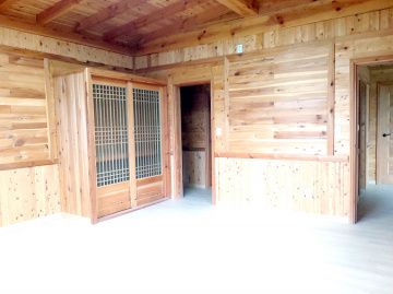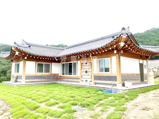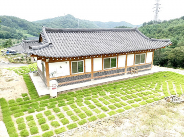 외관은 전통 한옥의 멋을 현대적으로 살려 지어졌고, 내부는 목재와 황토를 적극적으로 사용하여 건강한 생활환경을 마련했습니다. 지붕에는 진흙을 두텁게 올린 뒤 기와로 마감해 한옥 특유의 고즈넉함과 단열성을 동시에 확보하였으며, 실내는 방 세 칸과 거실, 주방, 욕실 두 개로 구성되어 생활에 불편함이 없습니다.