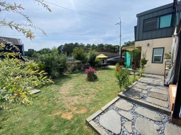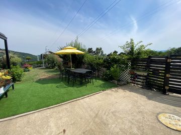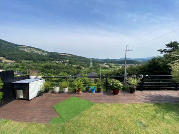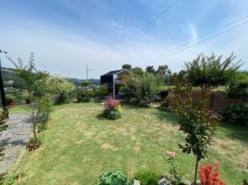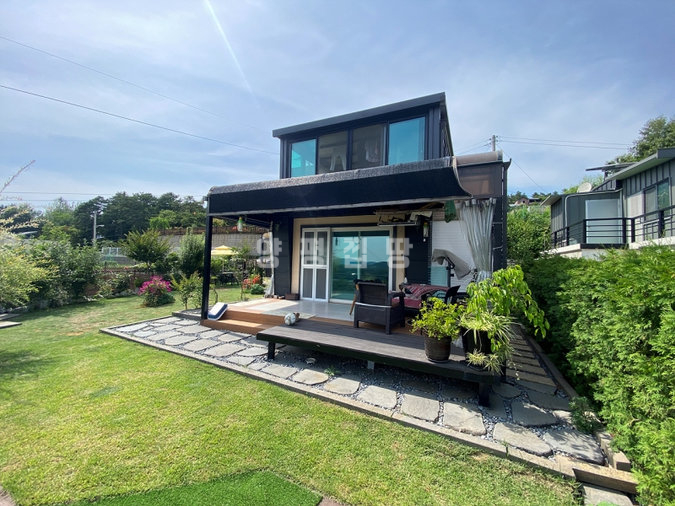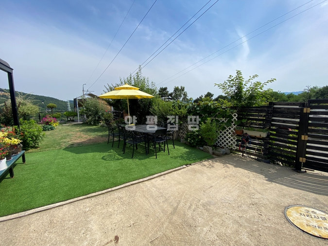 외부는 넓은 잔디마당과 데크, 다양한 조경수와 주차공간이 잘 어우러져 있습니다. 또한 태양광 설비와 지하수, 정화조 등 기본 시설이 잘 갖춰져 있어 관리가 용이합니다.