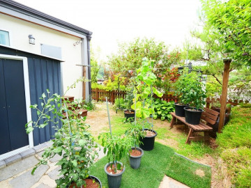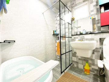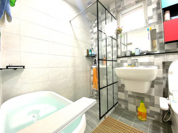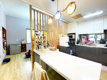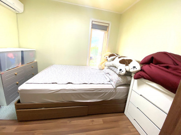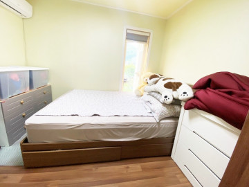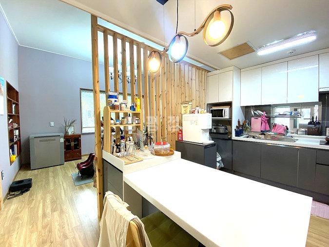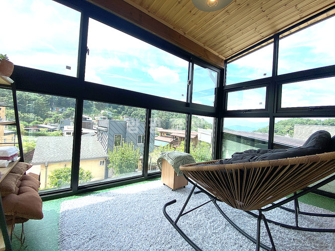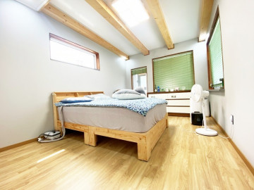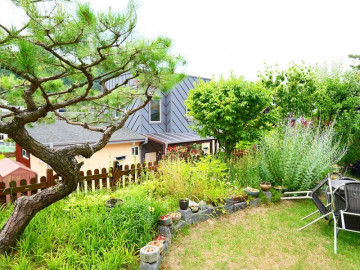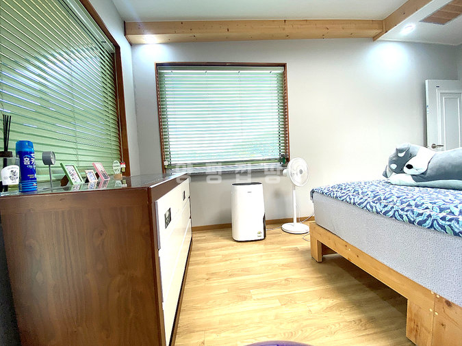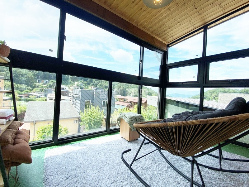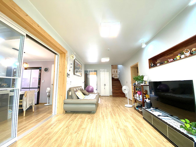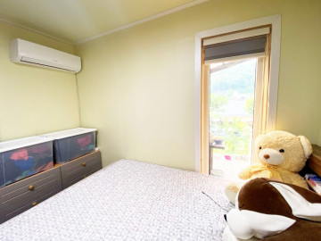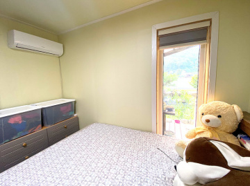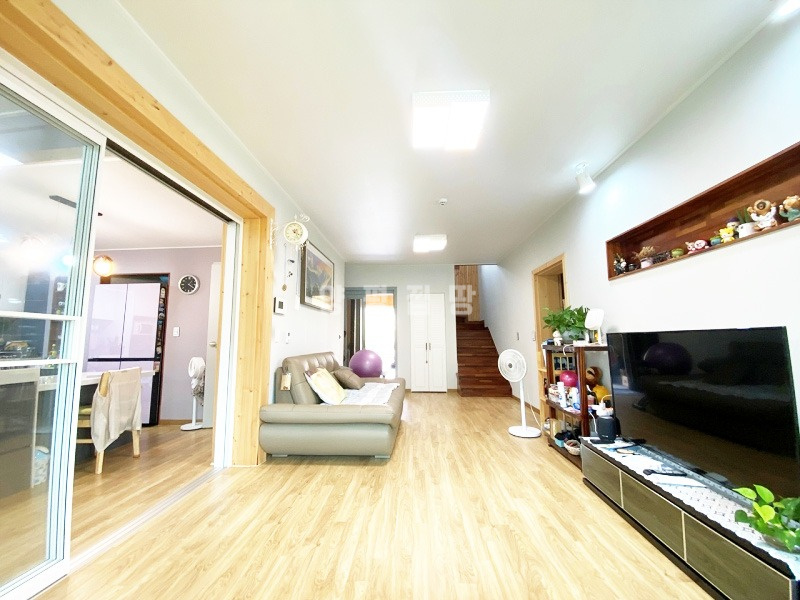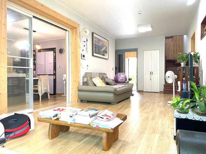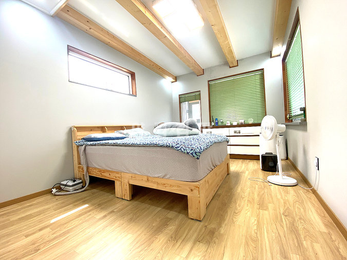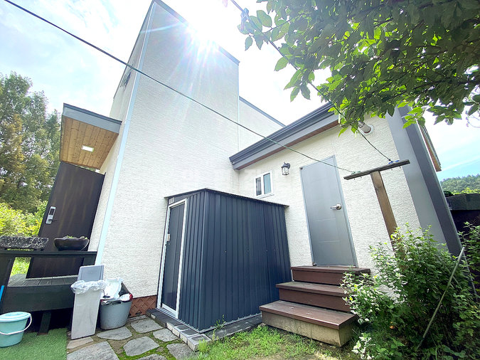목조 구조로 지어진 단층형 주택은 거실과 주방, 다용도실을 중심으로 침실 2개와 욕실 1개가 1층에, 그리고 침실과 욕실이 2층에 배치되어 있습니다. 슬라이딩 도어로 주방과 거실을 분리할 수 있고, 2층에는 전망이 좋은 넓은 테라스가 마련되어 활용도가 높습니다. 내부는 생활 동선을 고려해 설계되어 실용성과 편안함을 동시에 제공합니다.