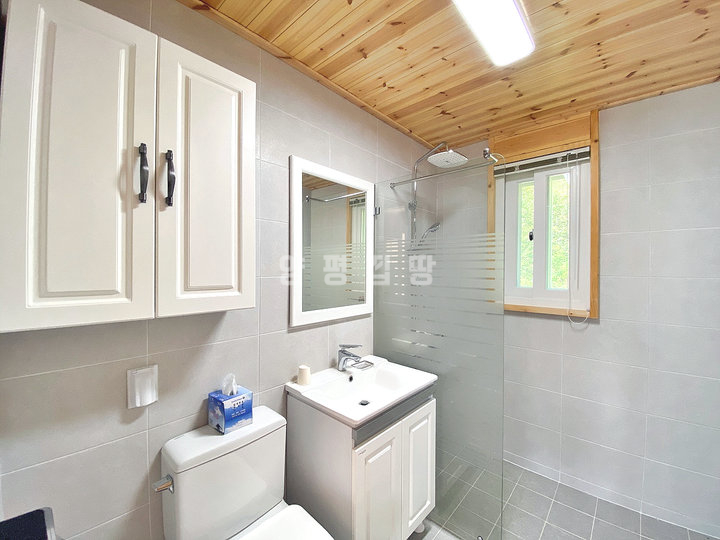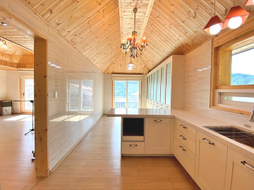 내부는 거실, 오픈형 주방, 다용도실, 침실 2개, 욕실 2개로 구성되어 있어 실용적인 동선을 갖추고 있습니다. 붙박이장과 블라인드가 설치되어 있으며, 박공형 천장으로 목재 향기가 은은하게 퍼져 건강한 생활 환경을 제공합니다.