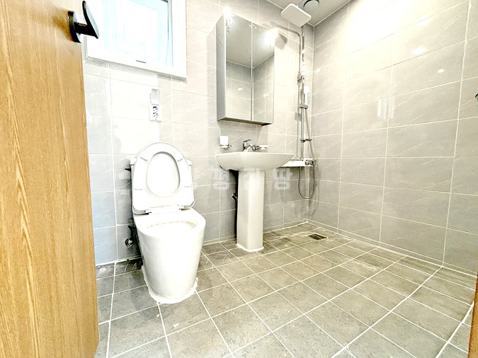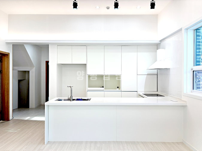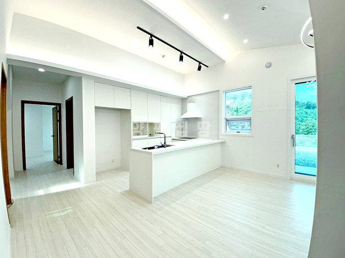 주택은 단층 구조로, 거실과 주방, 방 2개, 욕실 2개, 다용도실이 효율적으로 배치되어 있습니다. 내부는 목재와 실크벽지, 강마루 마감으로 아늑한 분위기를 주며, 붙박이장과 하이라이트 등 옵션이 설치되어 있어 생활 편리성이 높습니다.