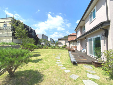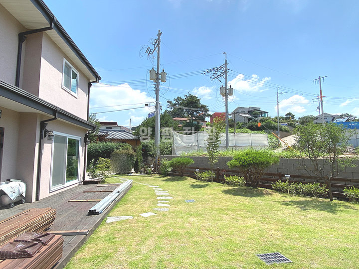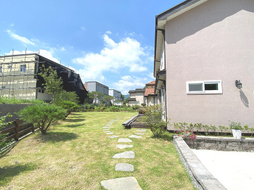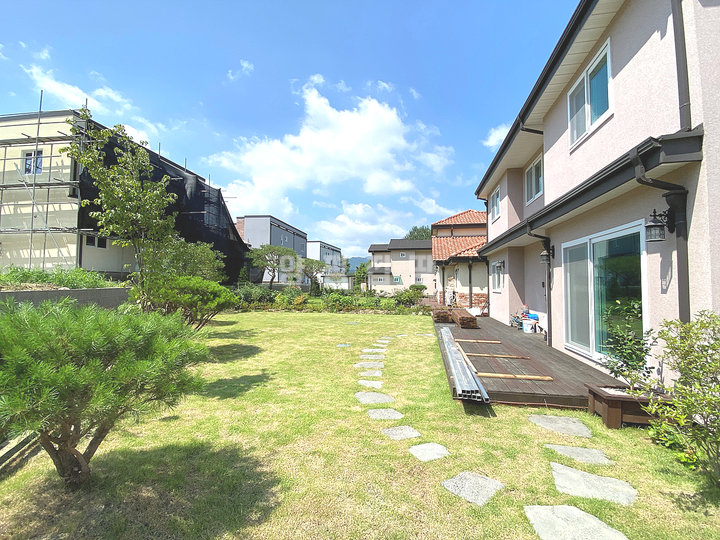 넓은 잔디정원과 데크, 야외 수돗가, 주차장 등으로 구성된 외부 공간은 전체 부지와 조화를 이루며, 주변에는 비슷한 규모의 주택들이 어우러져 고급스러운 분위기를 형성하고 있습니다. 현관에는 창고 공간도 마련되어 있어 실용성을 더합니다.