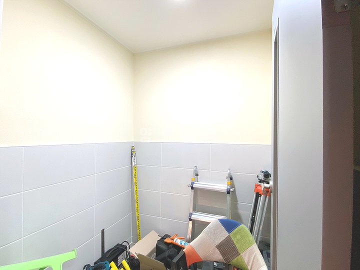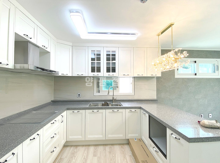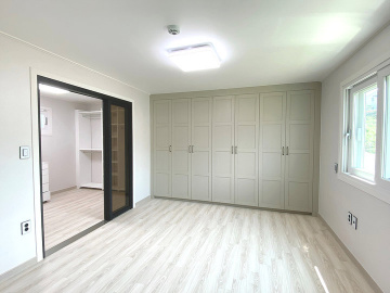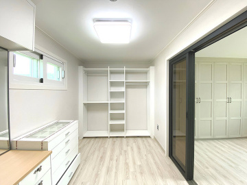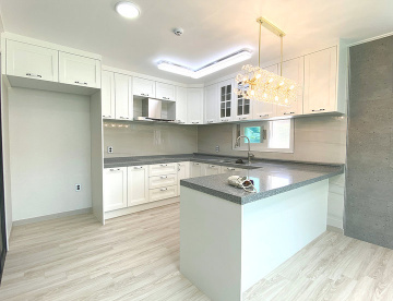 1층에는 중간 크기의 거실과 부부침실, 주방, 욕실, 다용도실이 있으며, 2층에는 침실 2개와 욕실이 구성되어 있습니다. 방마다 붙박이장이 설치되어 있고, 드레스룸과 파우더룸이 함께 구성된 침실도 있어 실내 활용도가 높습니다. 주방은 ㄷ자 구조로 상하부장이 설치되어 수납공간이 넉넉하며, 전기레인지와 T자 후드가 시공되어 있습니다.