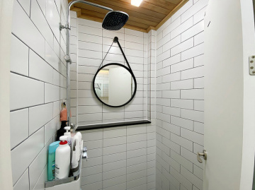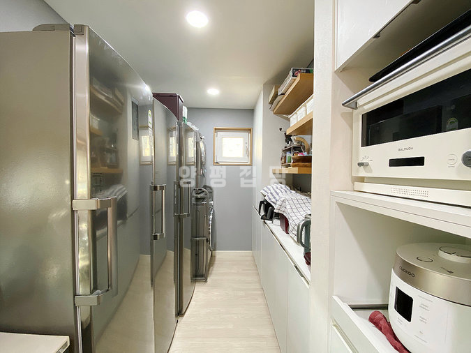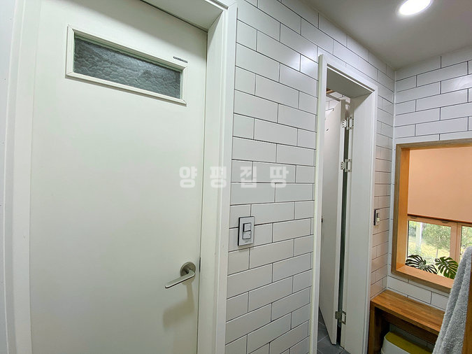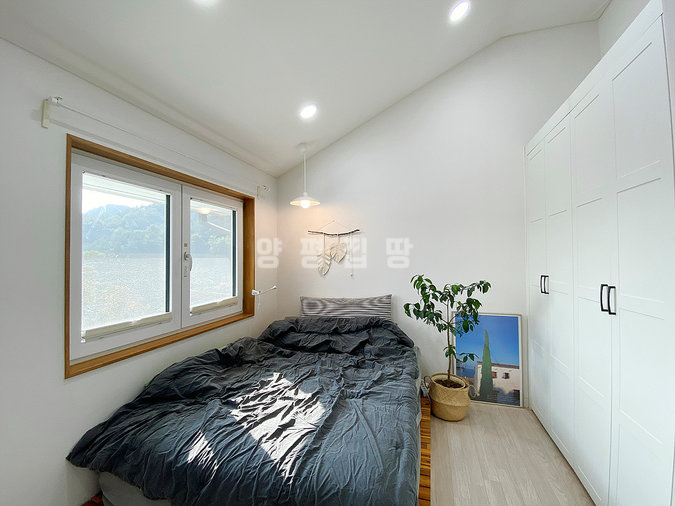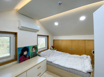 내부는 1층에 거실, 주방, 욕실이 있으며, 2층에 작은 거실과 2개의 침실, 욕실이 있는 구조입니다. 거실은 층고가 높아 개방감이 뛰어나며, 붙박이장이 설치되어 수납공간도 충분합니다.