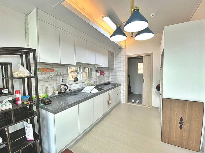 내부는 1층에 부부 침실과 거실, 주방, 다용도실이 있으며, 2층에 침실 2개와 욕실이 있는 구조입니다. 모든 침실과 거실에 시스템 에어컨붙박이장이 설치되어 있어 생활이 편리합니다. 넓은 잔디 마당과 텃밭, 조경수가 잘 갖춰져 있으며, 2대의 주차 공간도 확보되어 있습니다.