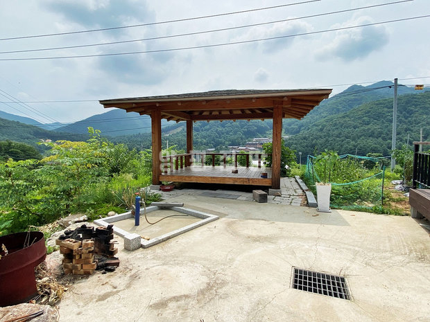 넓은 197평의 부지에는 실용적인 시멘트 마당과 텃밭 공간, 그리고 아늑한 정자가 마련되어 있습니다. 또한 8대까지 주차가 가능할 정도로 넓은 주차 공간을 확보하고 있어 편리합니다.