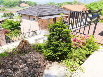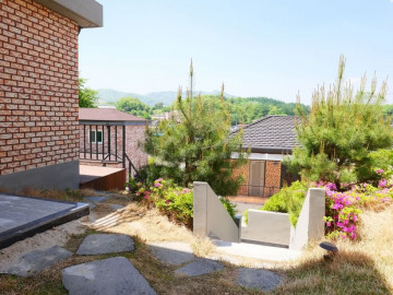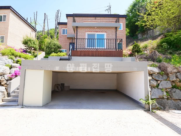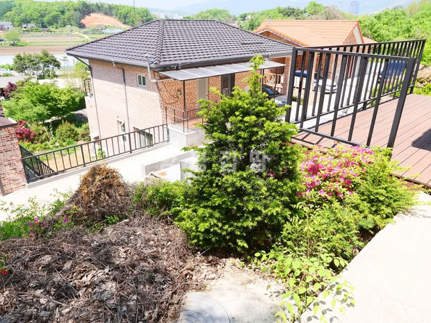 넓은 잔디마당에는 조경수와 텃밭이 깔끔하게 조성되어 있으며, 대형 SUV 두 대도 주차 가능한 벙커식 전동 셔터 주차장이 있어 차량을 안전하게 보관할 수 있습니다.