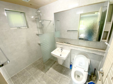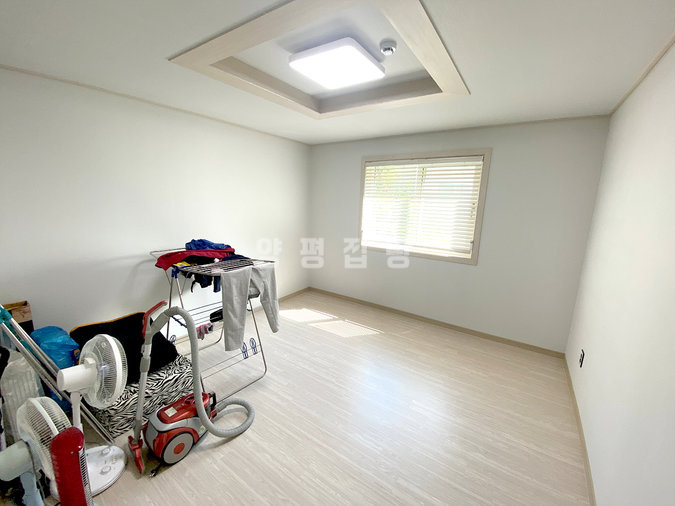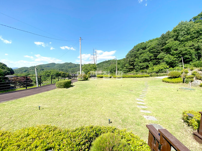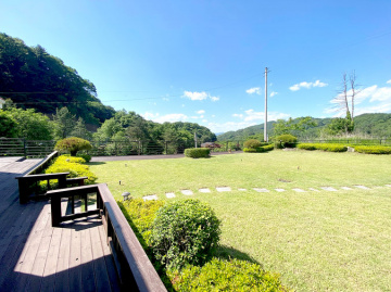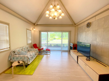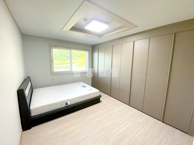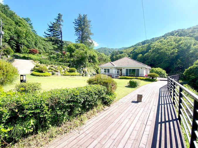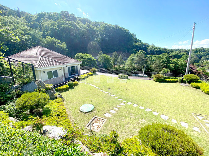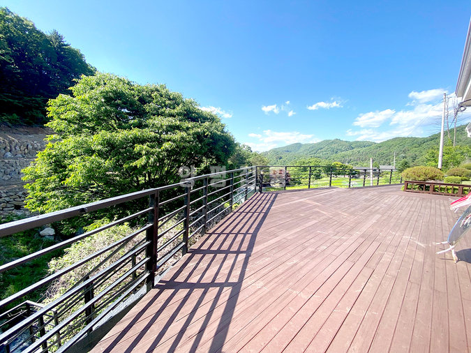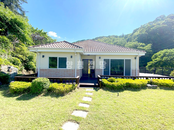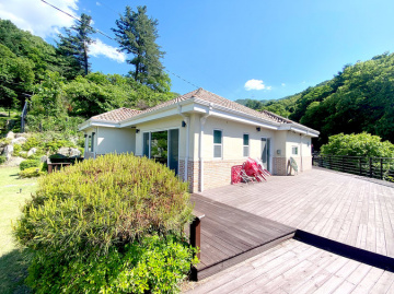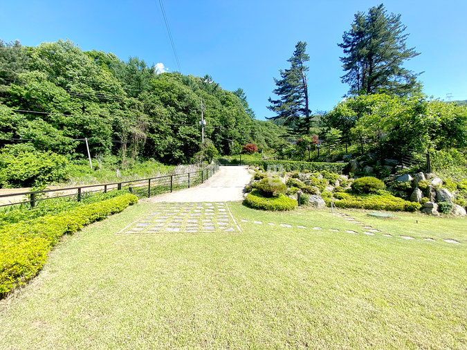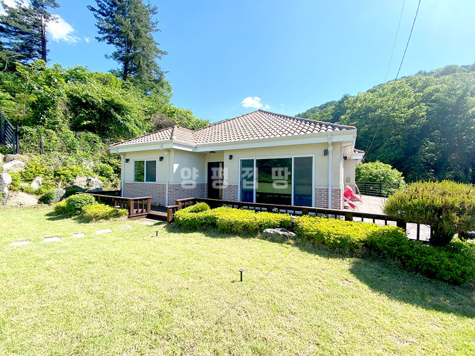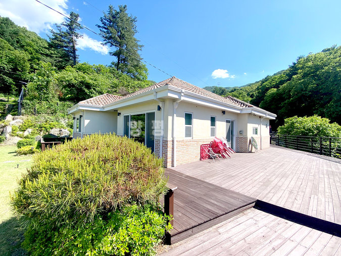 단열에 강한 목조 단층 구조로 지어져 생활 동선이 편리하고, 천장이 높아 개방감이 뛰어납니다. 실내는 방 3개와 욕실 2개를 갖추고 있으며, 안방에는 붙박이장이 설치되어 있어 수납이 용이합니다. 넓은 잔디 마당에는 데크와 조경수가 잘 관리되어 있고, 계곡으로 내려가는 전용 계단이 있어 편리합니다.
