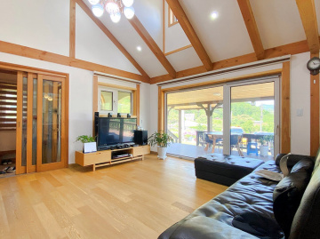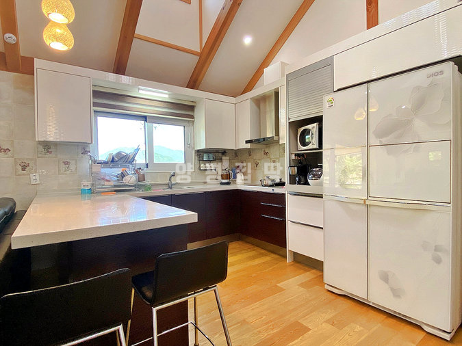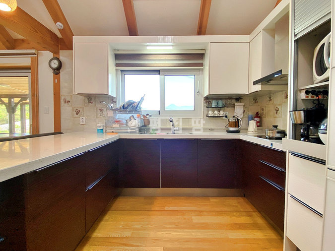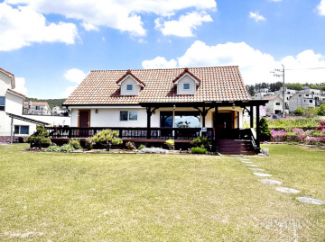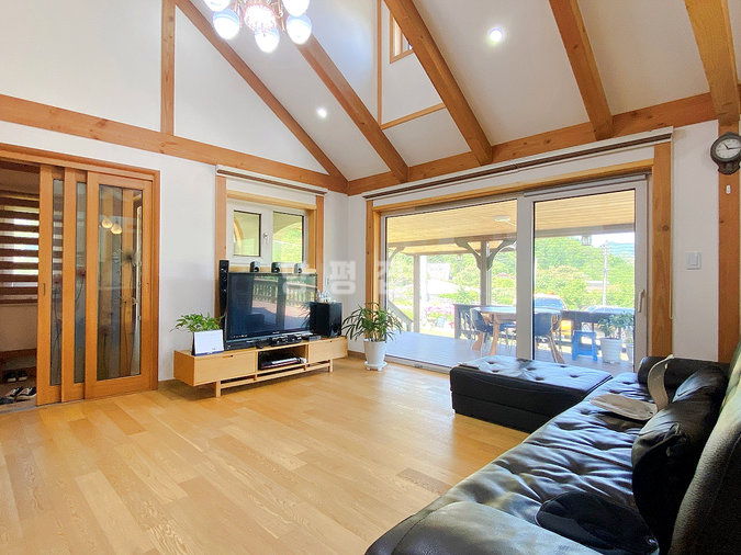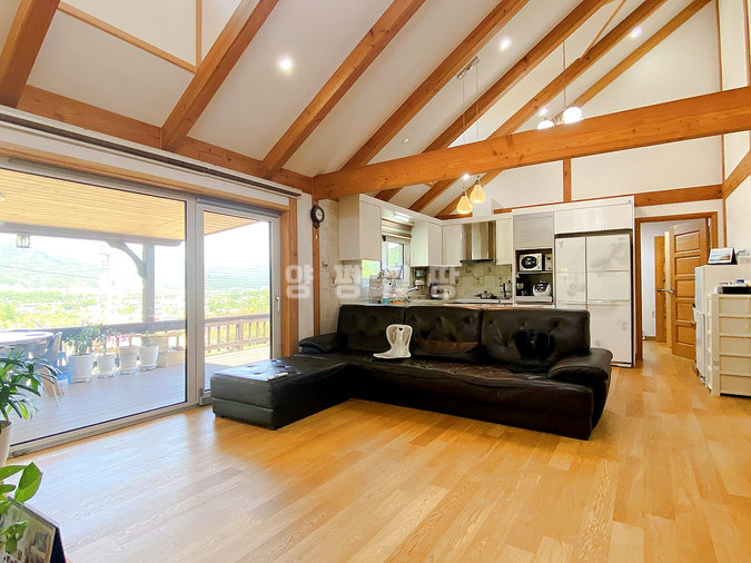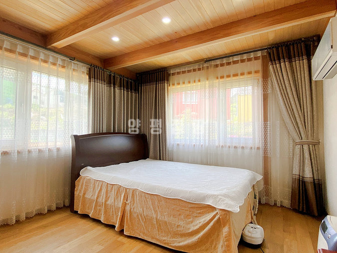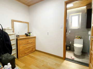 친환경 자재인 편백나무와 규조토로 마감하여 단열에 특히 신경 쓴 목조주택으로, 은은한 나무 향과 함께 쾌적한 주거 환경을 제공합니다. 층고가 높아 개방감이 느껴지는 거실과 효율적인 주방, 넓은 다용도실을 갖추고 있으며, 방마다 붙박이장이 설치되어 있어 공간 활용이 뛰어납니다.