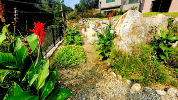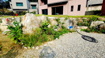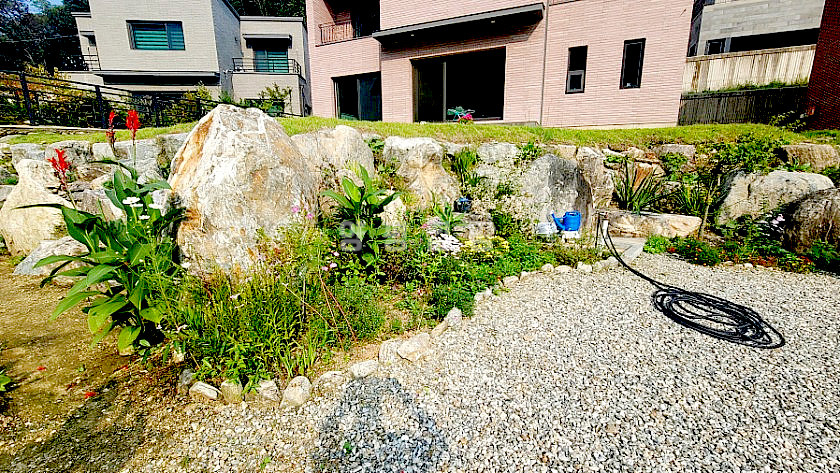 외부는 2단으로 구성된 정원으로, 윗단에는 잔디와 데크, 꽃나무가 식재될 예정이며, 아랫단은 텃밭 공간으로 활용 가능합니다. 주차박스 형태의 주차공간은 차량 2대까지 수용 가능하며, 주택 뒷편으로도 차량 진입이 가능해 동선이 편리합니다.