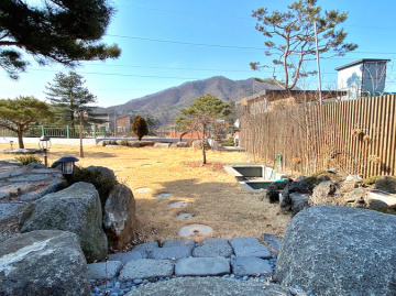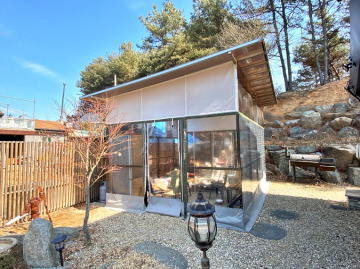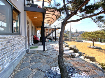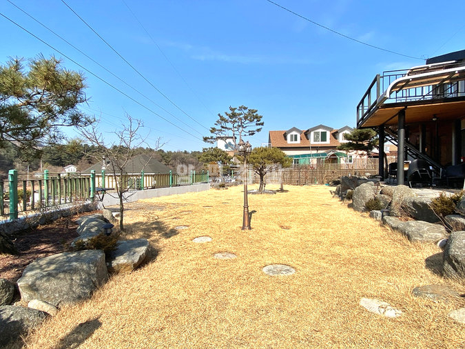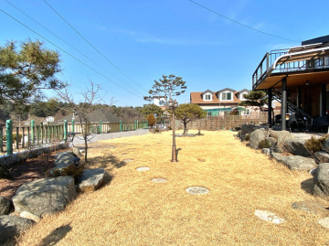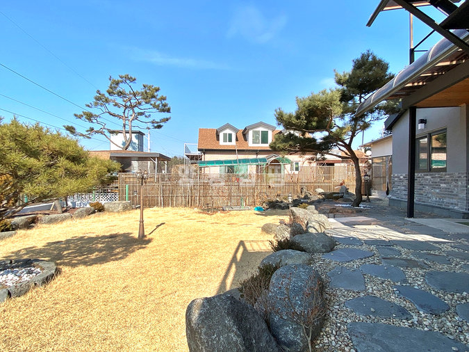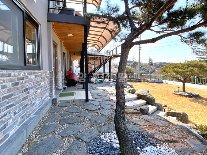 외부는 잔디마당과 디딤돌, 조경수로 꾸며진 정원과 함께, 주차박스와 펜스로 마감된 깔끔한 외부 공간이 마련되어 있습니다. 주차박스 일부는 사무실로 개조되어 있으며, 바베큐장과 현무암 데크도 설치되어 있어 여가 공간으로도 활용 가능합니다.