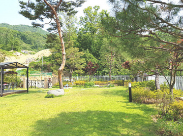 외부 공간은 넓은 잔디마당과 데크, 조경수로 채워져 있고, 렉산 지붕이 설치된 주차공간도 마련되어 있습니다. 또한 야외수돗가가 있어 정원 관리에 편리합니다.