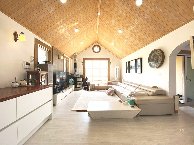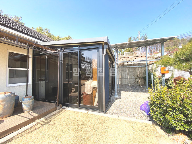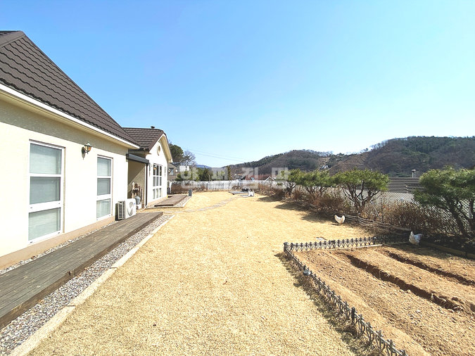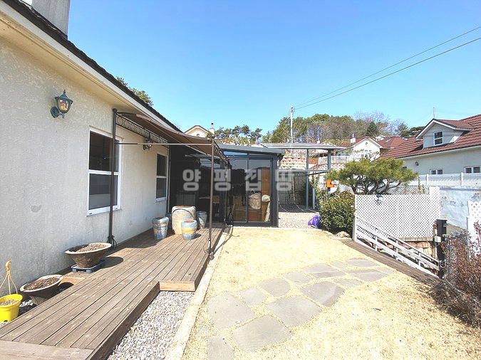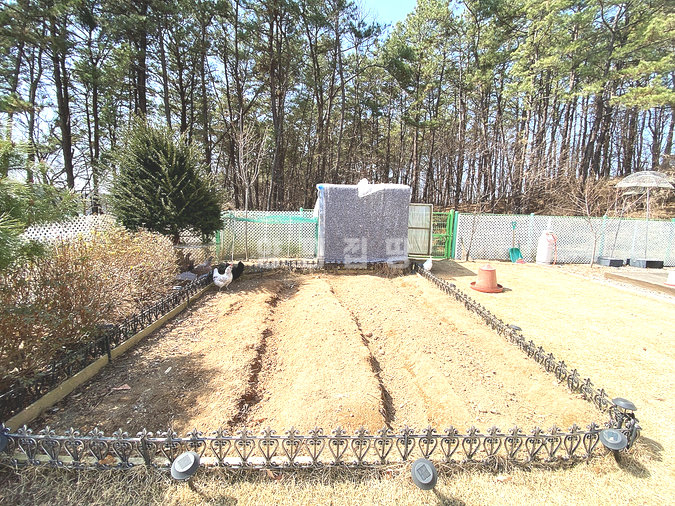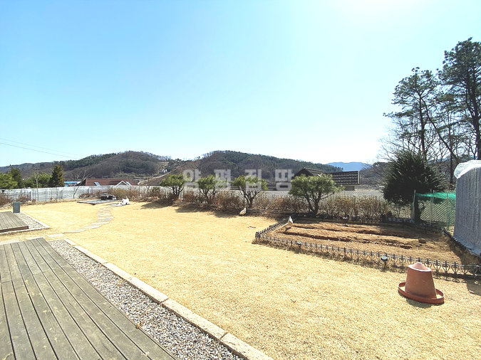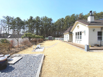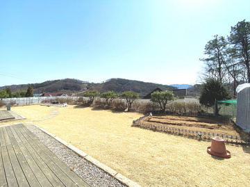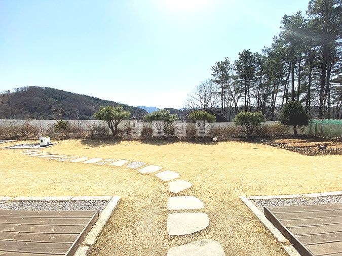 대지와 마당이 함께 포함된 약 300평 규모의 넓은 부지는 단차가 거의 없어 활용도가 높으며, 잔디와 디딤돌, 조경석이 어우러진 정원과 주차 공간이 마련되어 있습니다. 주택과 연결된 마당은 개방감이 뛰어나고, 조용한 숲세권 환경 속에서 사계절의 변화를 한눈에 담을 수 있는 장점이 있습니다.