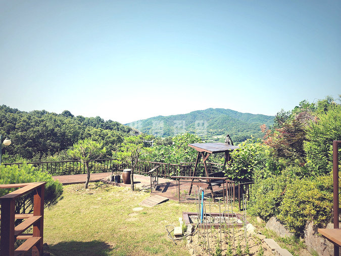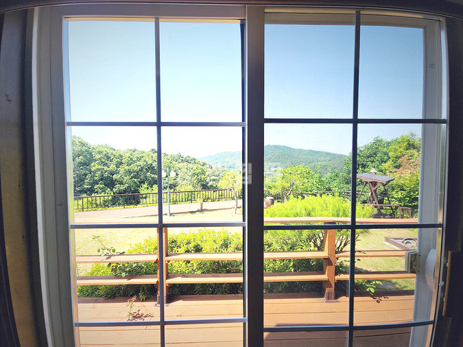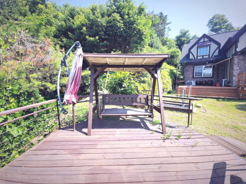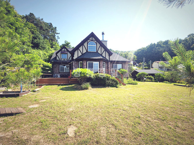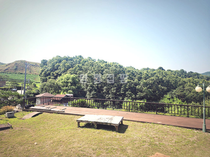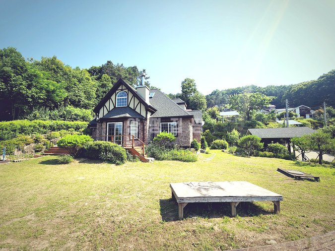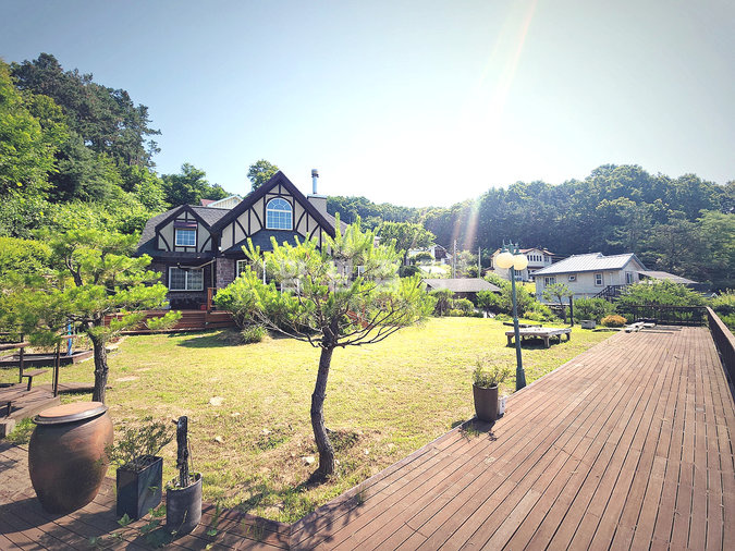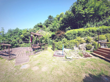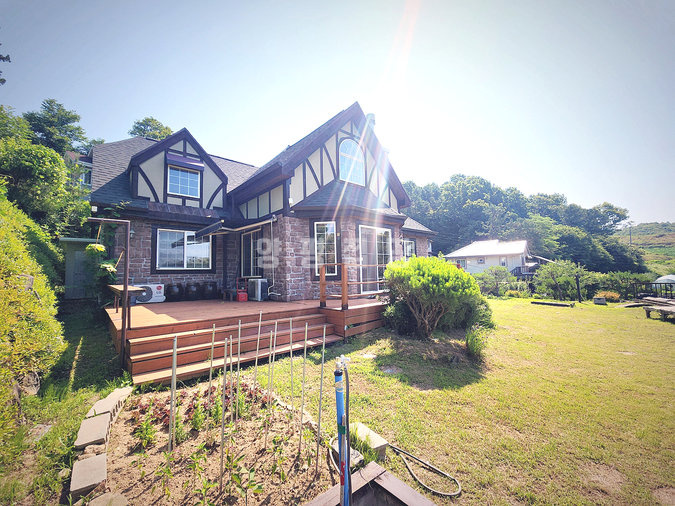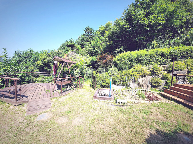 잔디와 디딤석이 어우러진 마당은 깔끔하게 관리되어 있으며, 넓은 데크와 나무그네, 텃밭 공간까지 마련되어 전원생활의 여유를 더해줍니다. 자주식 차고와 정원 조경이 조화를 이루어 실거주와 휴식을 동시에 충족시키는 구조입니다.