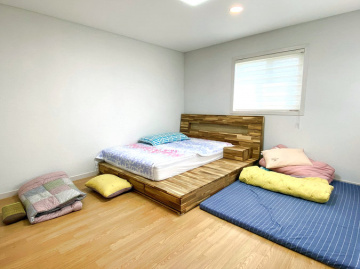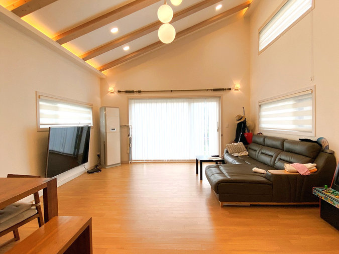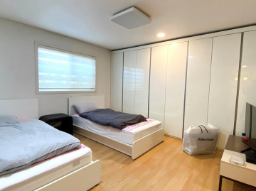 주택은 목조 구조로 지어졌으며, 내부는 거실과 주방을 중심으로 방과 욕실이 적절히 배치되어 실용성이 돋보입니다. 1층에는 거실과 주방, 침실과 욕실 2개가 있으며, 2층에는 침실 2개와 욕실이 있어 가족 생활에 충분한 공간을 제공합니다. 거실 천장이 높아 개방감이 뛰어나며, 곳곳에 붙박이장이 설치되어 수납공간도 넉넉합니다.