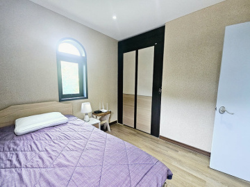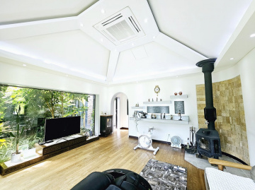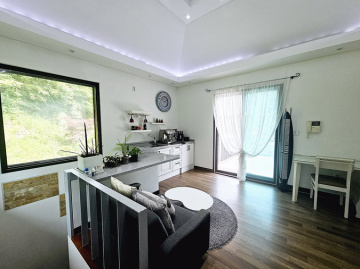 내부는 1층에 거실과 주방, 침실 2개, 욕실 1개가 있으며, 2층에는 거실과 주방, 침실과 욕실, 테라스가 연결된 구조입니다. 심야전기 난방과 벽난로가 더해져 사계절 쾌적한 생활이 가능하며, 공간 활용도가 뛰어납니다.