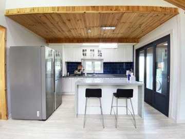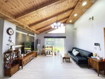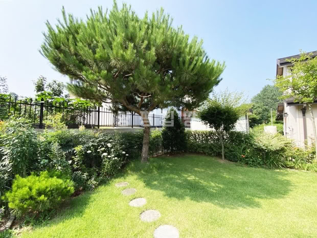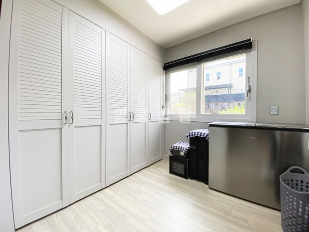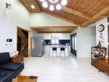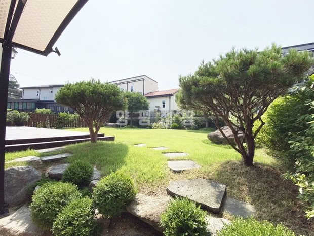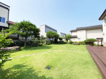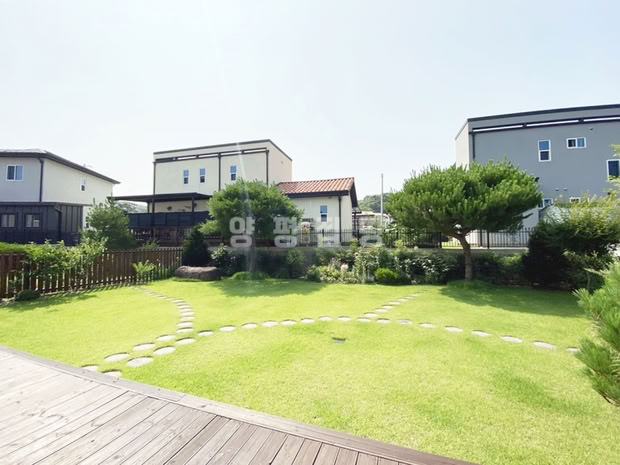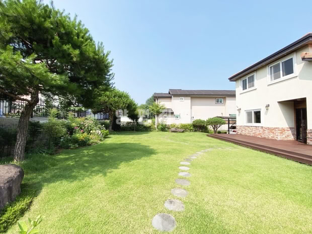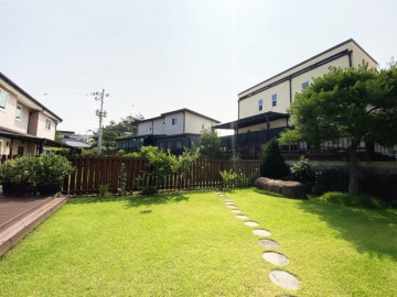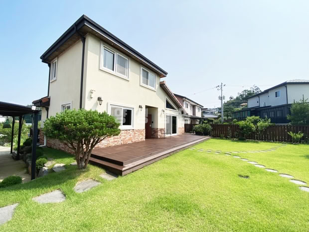 주택은 남동향 배치로 채광이 좋고, 넓은 잔디 마당과 데크가 조경과 어우러져 휴식 공간으로 활용도가 높습니다. 1층에는 드레스룸과 다용도실 겸 세탁실이 마련되어 있어 실생활의 편의성이 강화되어 있으며, 내부 구조는 효율적으로 설계되어 있습니다.