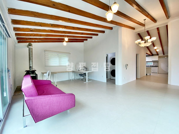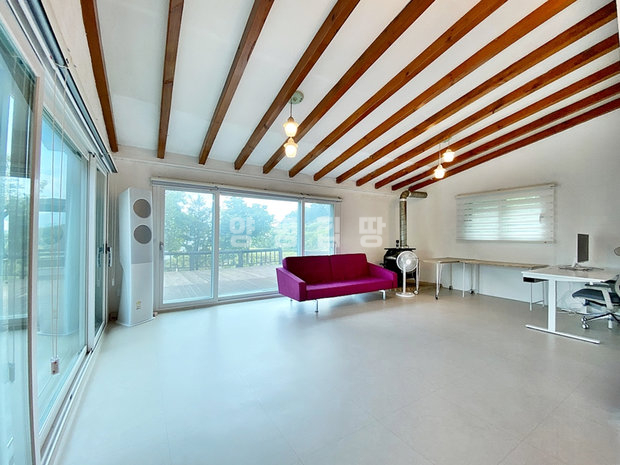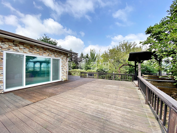 본 주택은 시간이 지나도 변치 않는 멋과 견고함을 자랑하는 튼튼한 벽돌(조적조)로 지어졌습니다. 주 생활 공간은 모든 세대가 선호하는 편리한 단층 구조이며, 특히 거실은 높은 박공지붕으로 설계되어 실제 평수보다 훨씬 넓고 쾌적한 공간감을 선사합니다. 거실에 설치된 벽난로는 전원생활의 아늑함과 낭만을 더합니다.