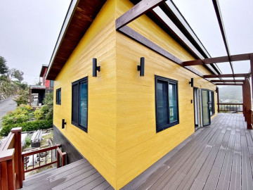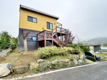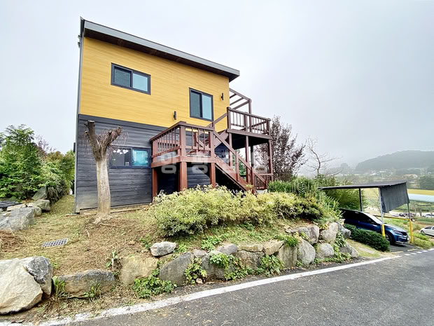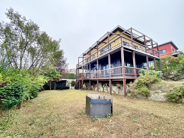본 전원주택은 1층과 2층에 각각 방, 거실, 주방, 욕실, 다용도실을 모두 갖추고 있어 두 세대가 완전히 독립적으로 거주할 수 있도록 실용적으로 설계되었습니다. 주택이 앉은 터와 마당 공간이 2단으로 분리되어 입체적인 공간감을 느낄 수 있으며, 넓은 나무 데크는 여유로운 휴식처를 제공합니다.