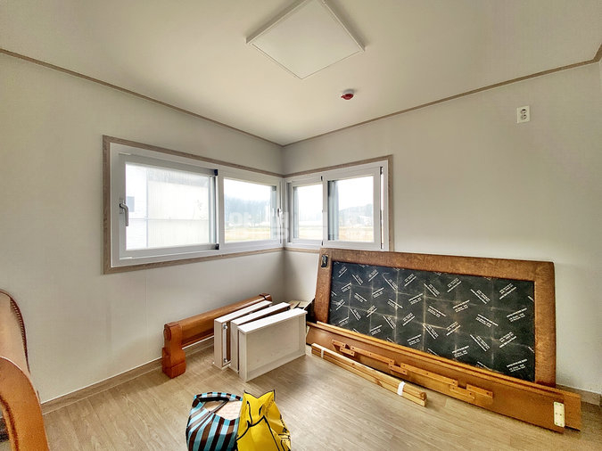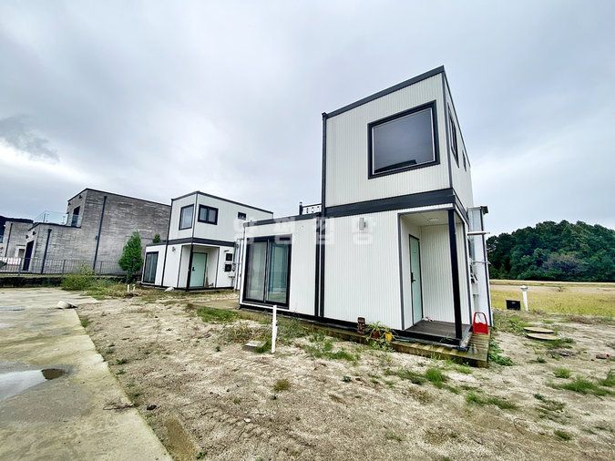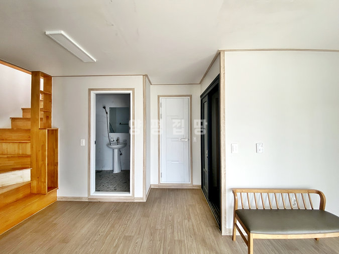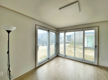 1층에는 방과 거실, 주방, 욕실을, 2층에는 방과 욕실, 야외 테라스를 두어 공간을 효율적으로 활용했습니다. 남동향으로 배치되어 채광이 좋고 하천 조망이 가능하며, 서쪽으로는 시원하게 트인 전망을 자랑합니다.