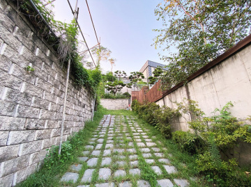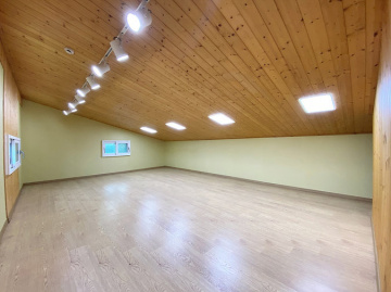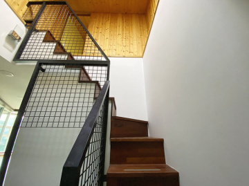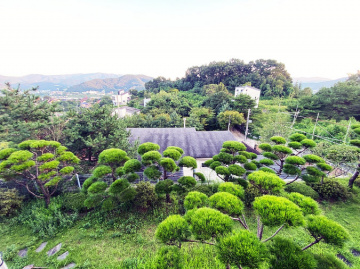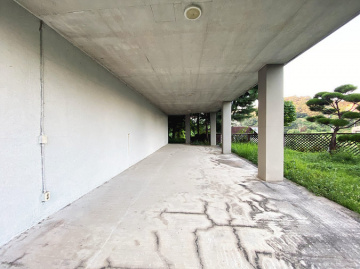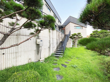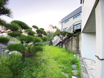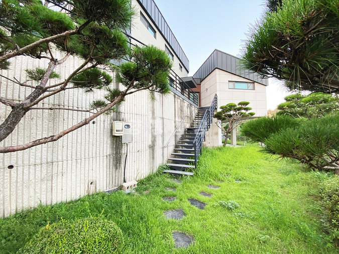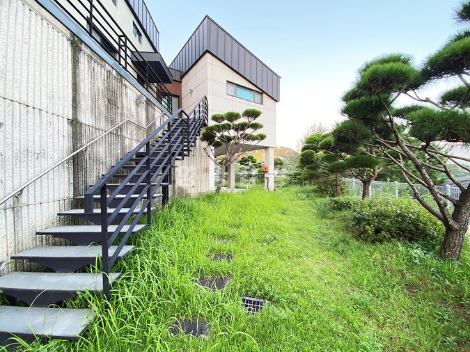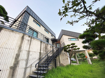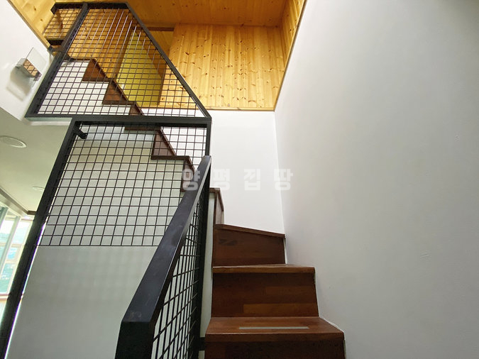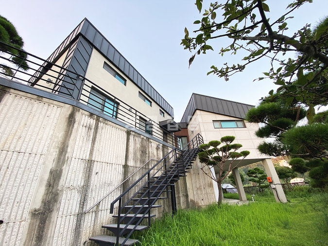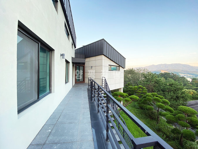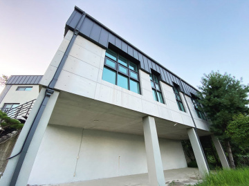 본 주택은 남동향으로 배치되어 거실과 옥상 테라스 등 집안 곳곳에서 아름다운 남한강 조망을 누릴 수 있습니다. 'ㄷ'자 구조로 건물 중앙에 중정을 둔 독특한 설계가 돋보이며, 1층에 방 3개와 거실, 2개의 주방, 2개의 욕실이 배치되어 있고 2층은 넓은 다락 공간으로 구성되어 있습니다.