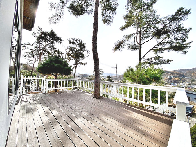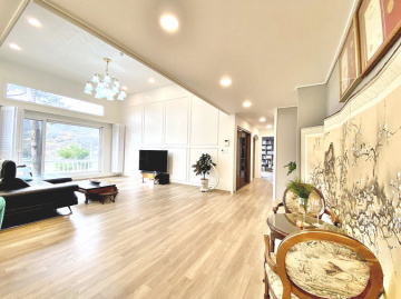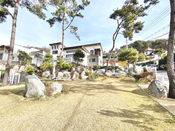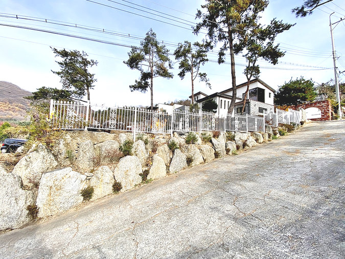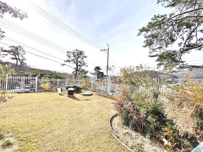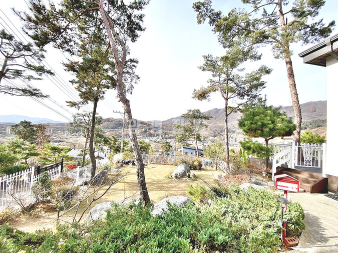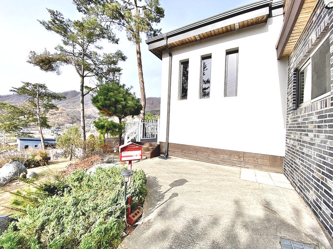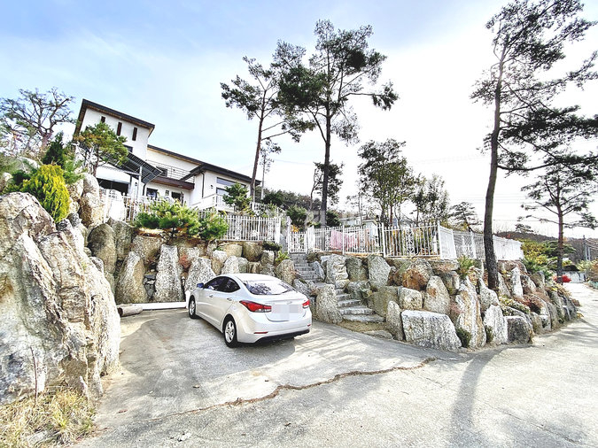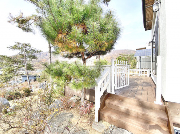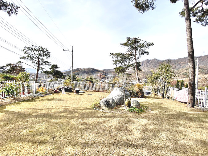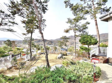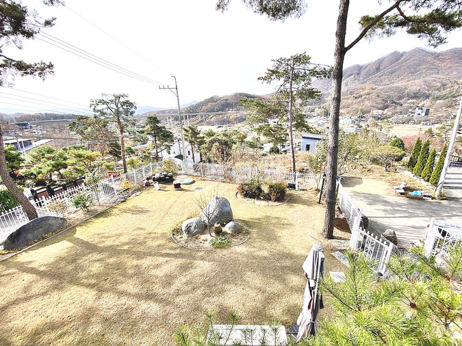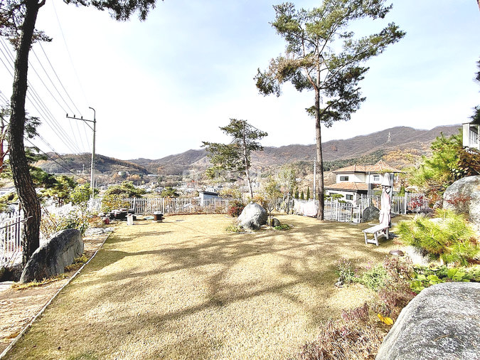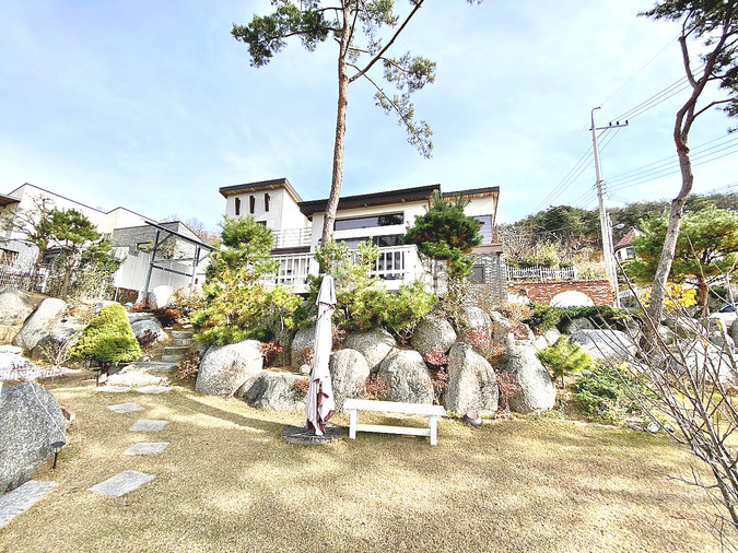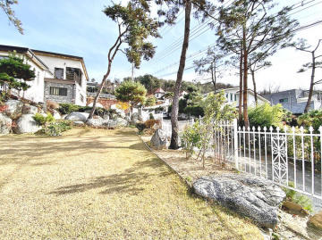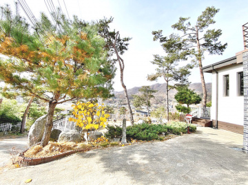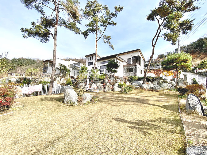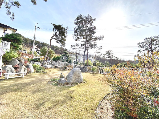 특히 이 집은 조경석 공사에만 약 1억 원을 투자했을 정도로 정원에 공을 들였습니다. 대형 소나무와 야생화, 디딤석이 어우러진 잔디 마당은 품격 있는 전원생활을 선사합니다. 217평의 넓은 대지에 2단 토목 공사를 하여 공간 활용도를 높였습니다.