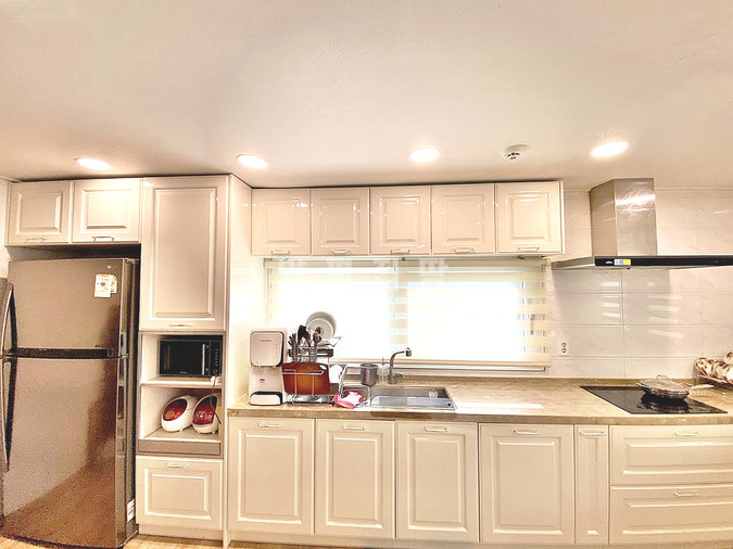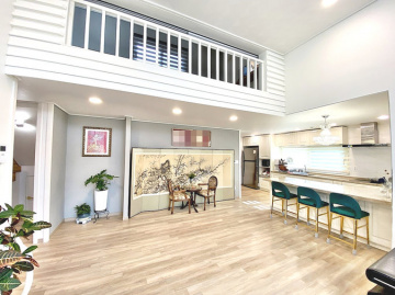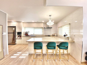 1층은 안방(드레스룸, 파우더룸 포함)과 거실, 주방, 다용도실로, 2층은 방 2개와 알파룸, 테라스로 구성된 50평형의 넉넉한 구조입니다. 태양광 패널이 설치되어 있어 전기료 절감 효과도 누릴 수 있습니다.