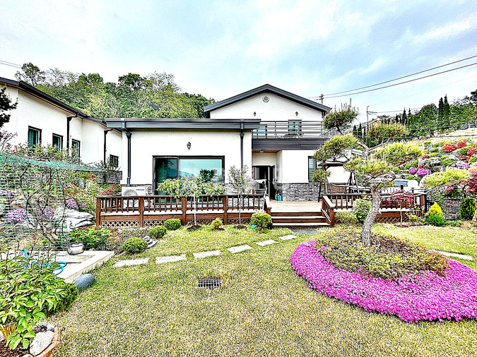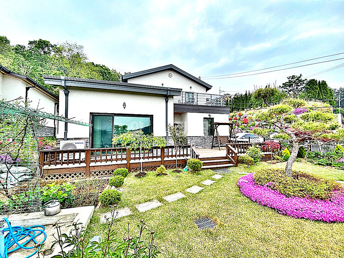 지붕에는 태양광 패널이 설치되어 있어 전기료 절감에 도움이 되며, 잔디 마당과 텃밭, 조경수 등이 잘 어우러져 있습니다. 2차선 도로와 버스정류장도 도보권에 있어 전원생활의 여유와 도심의 편리함을 동시에 누릴 수 있는 실속 있는 매물입니다.