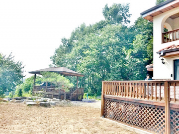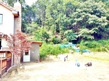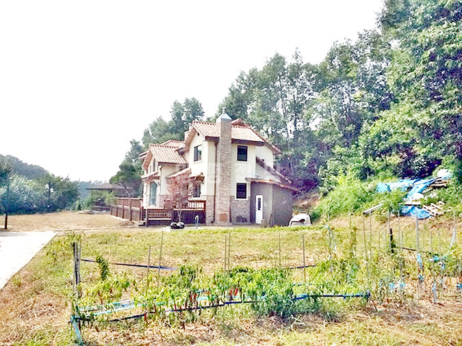 지평면 옥현리 매봉산 자락, 422평의 넓은 대지 위에 자리한 그림 같은 전원주택입니다. 국유지 구거 약 60평을 추가로 점용하고 있어 실제 사용하는 토지 면적은 더욱 넓습니다.
