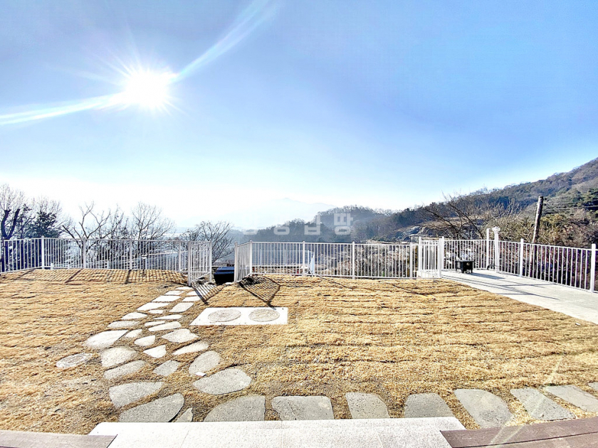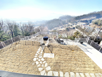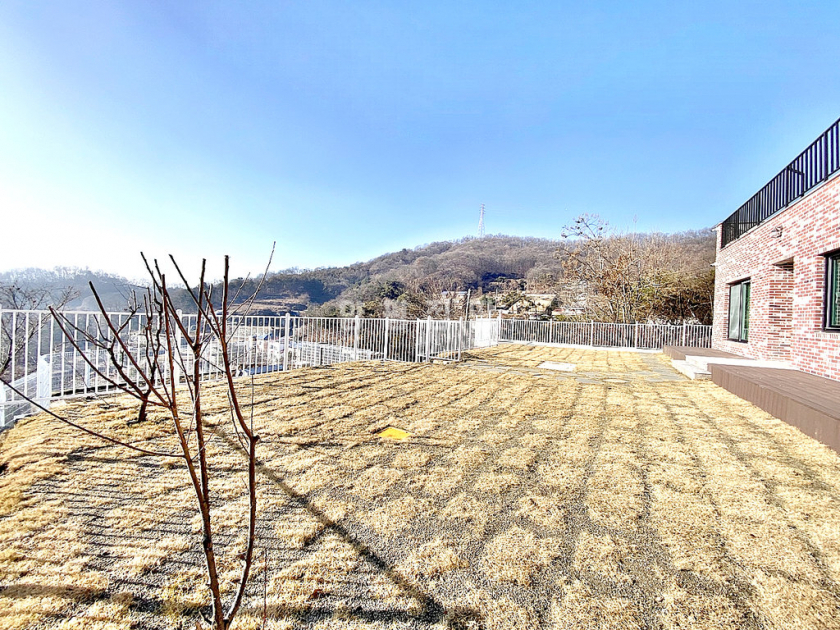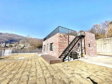 총 대지면적 약 226평(도로지분 포함)은 2단으로 토목 공사가 되어 있습니다. 아랫단은 텃밭과 주차 공간으로, 윗단은 주택과 잔디 마당으로 구성되어 공간 활용도가 높습니다. 내부는 방 2개와 욕실 2개(안방, 공용), 거실, 주방, 세탁실 겸 다용도실로 구성되어 있으며, 외부 철제 계단을 통해 옥상을 단독으로 사용할 수 있습니다.