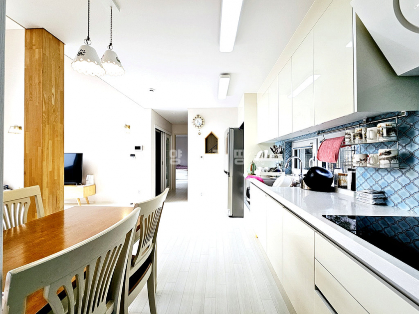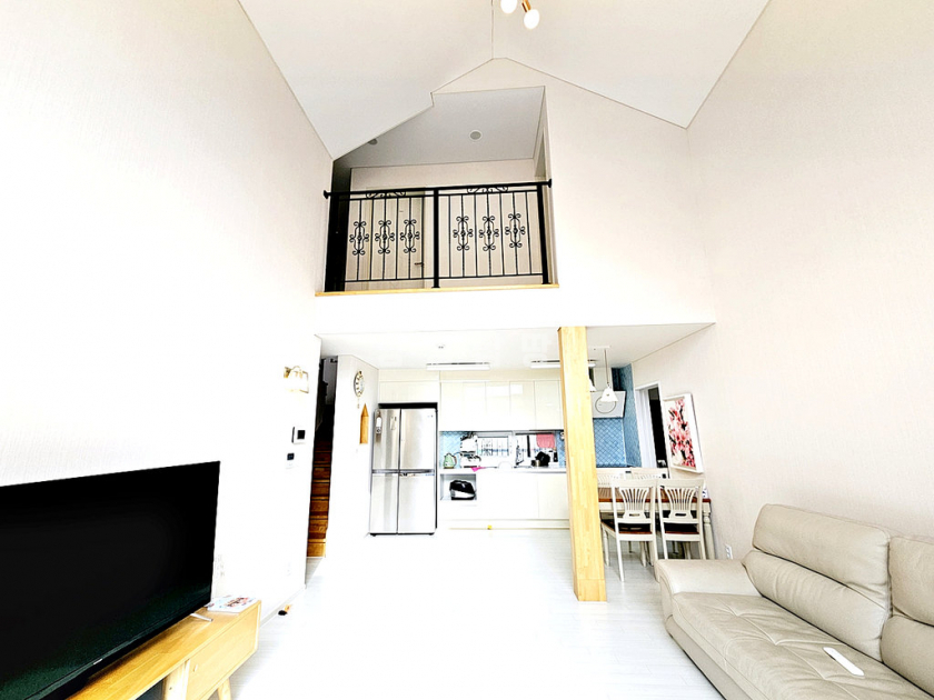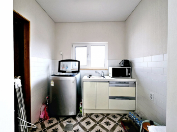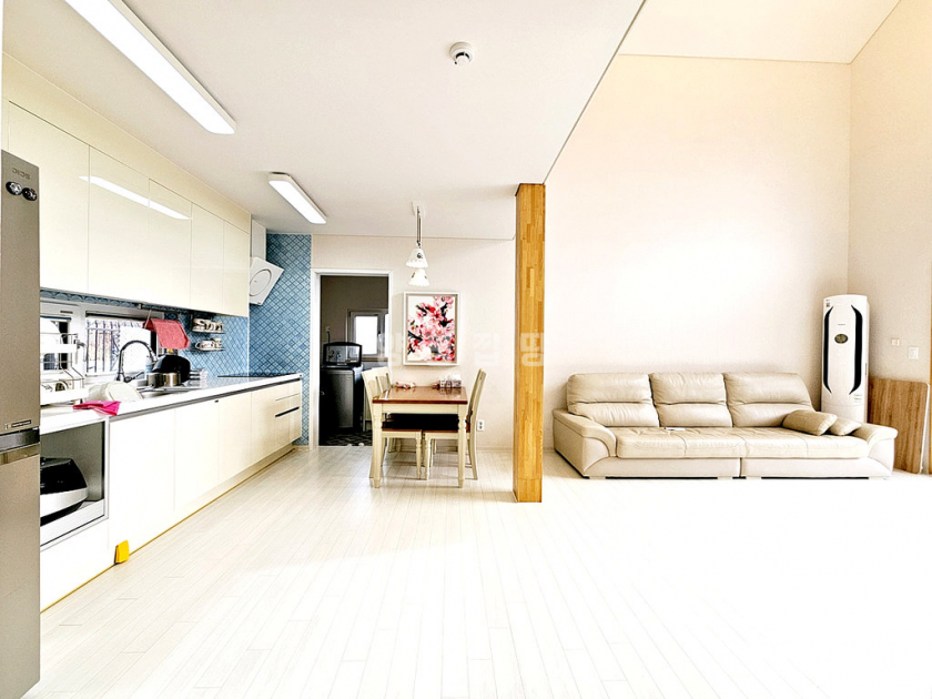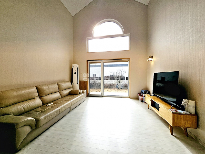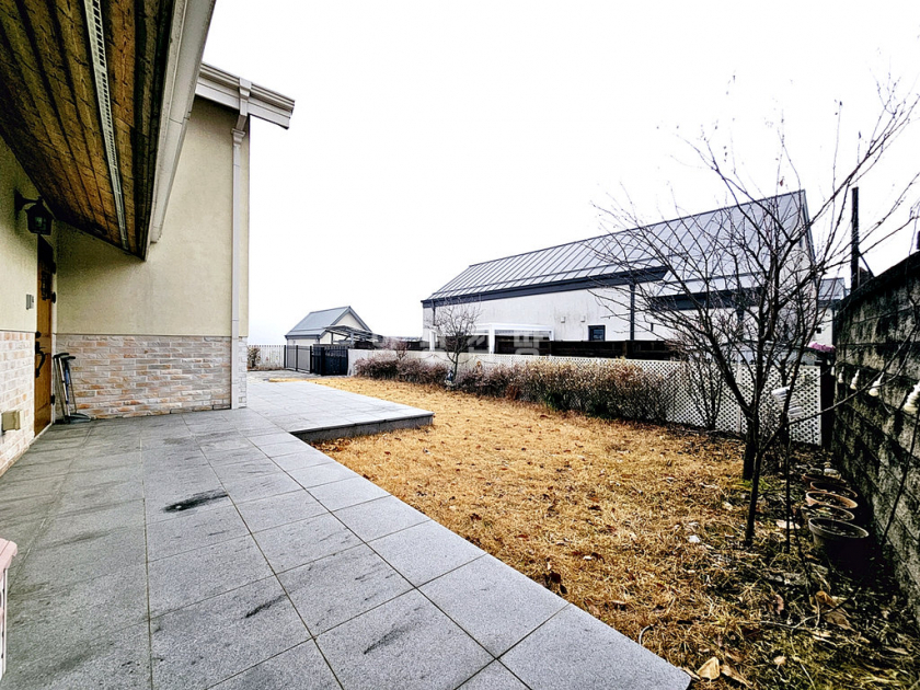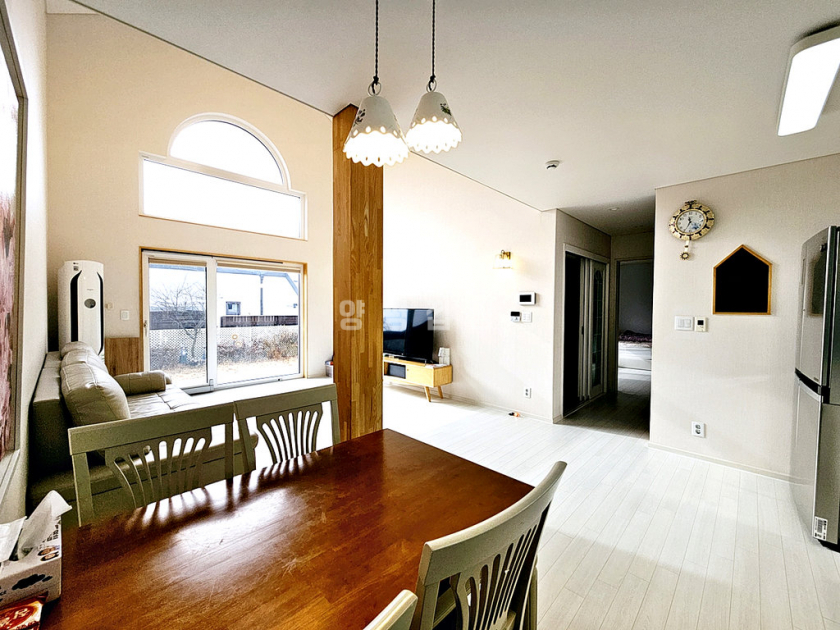 거실 기준 남향으로 채광이 좋고, 1층 거실 천장이 2층까지 트여 있어 개방감이 뛰어납니다. 주방 옆 다용도실에는 보조 싱크대와 식기세척기가 설치되어 있고 외부 출입문이 있어 동선이 편리합니다. 난방은 스마트폰 원격 조정이 가능한 기름보일러를 사용합니다. 깔끔한 잔디 정원과 실용적인 구조를 갖춘 완성도 높은 전원주택입니다.