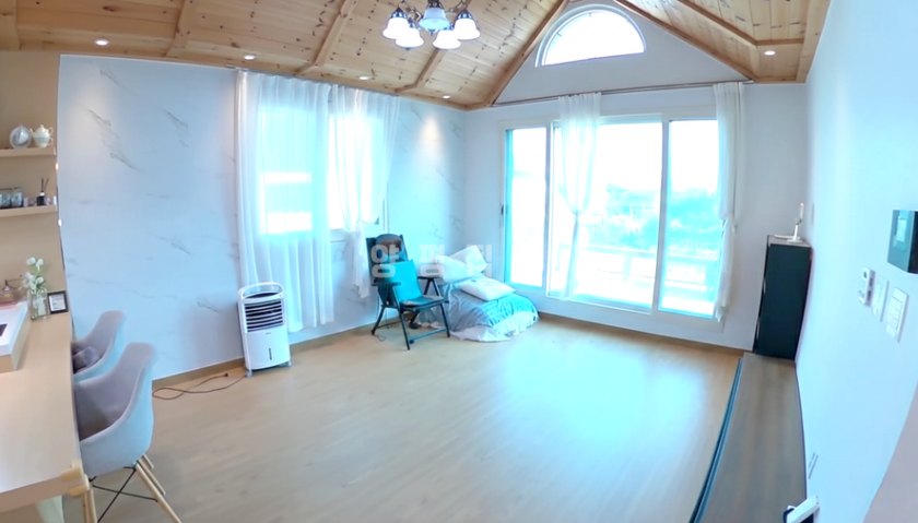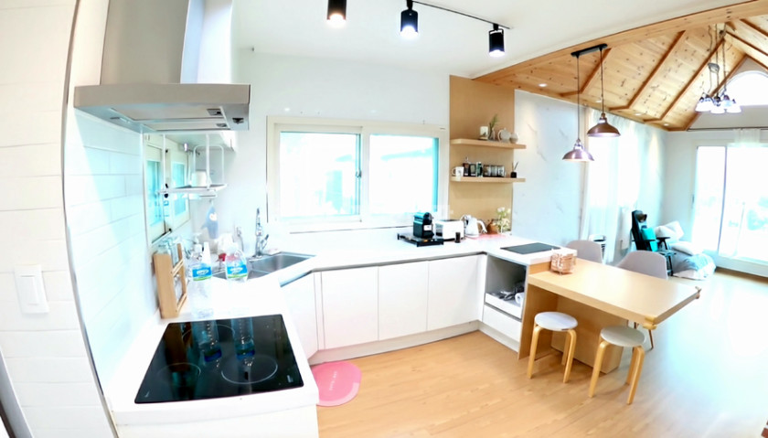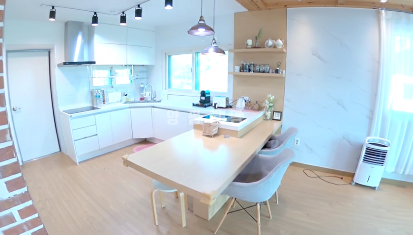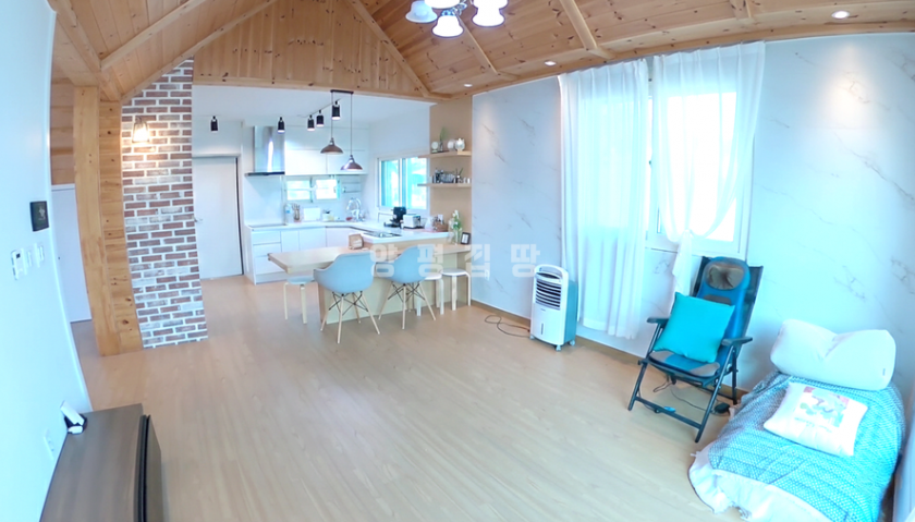거실은 박공지붕 형태로 층고가 높아 개방감이 크며, 주방은 아일랜드 식탁을 갖춘 오픈형 구조로 편리하게 꾸며졌습니다.